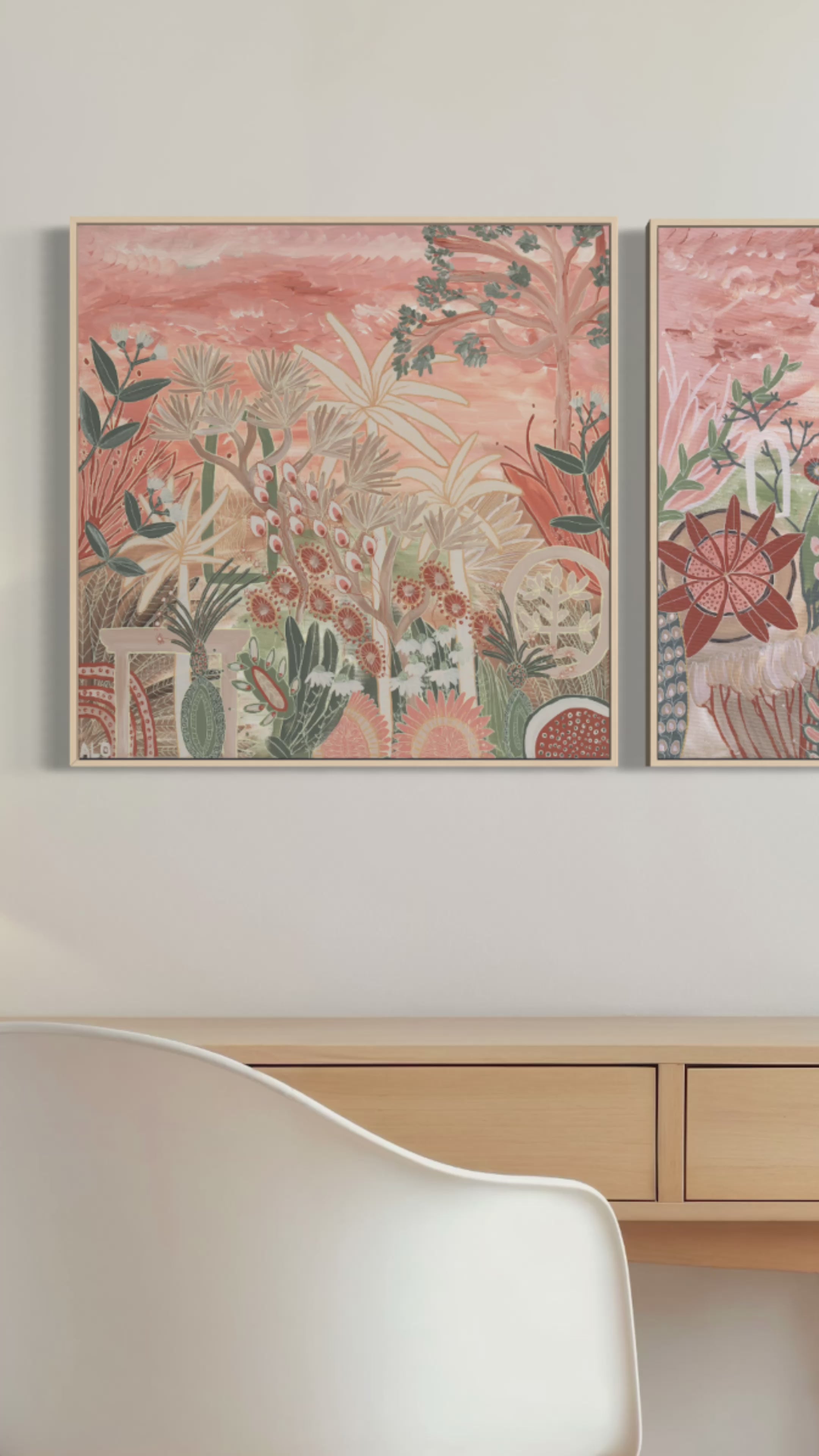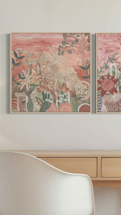 Angophora Reserve & Formentera Dreaming pair of artworks feature a blush sunset sky with an abundance of local flowers, shrubs, and trees in a colour palette of blush, white, olive green, and rust.