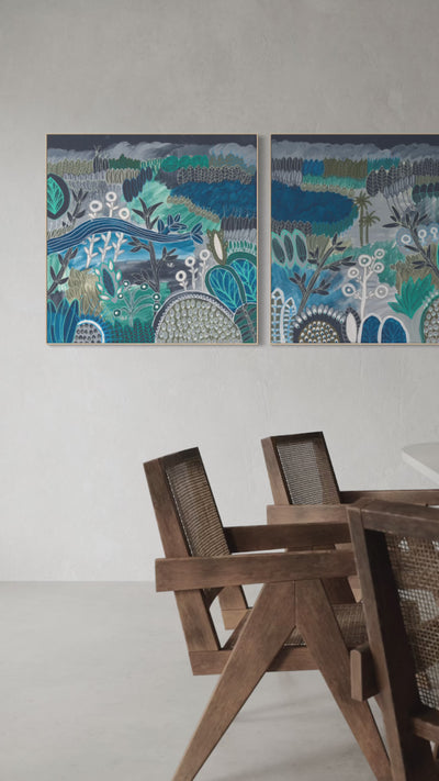 Australian native landscape featuring palm trees, seed pods, succulent plants and trees beneath a moody blue skyline.