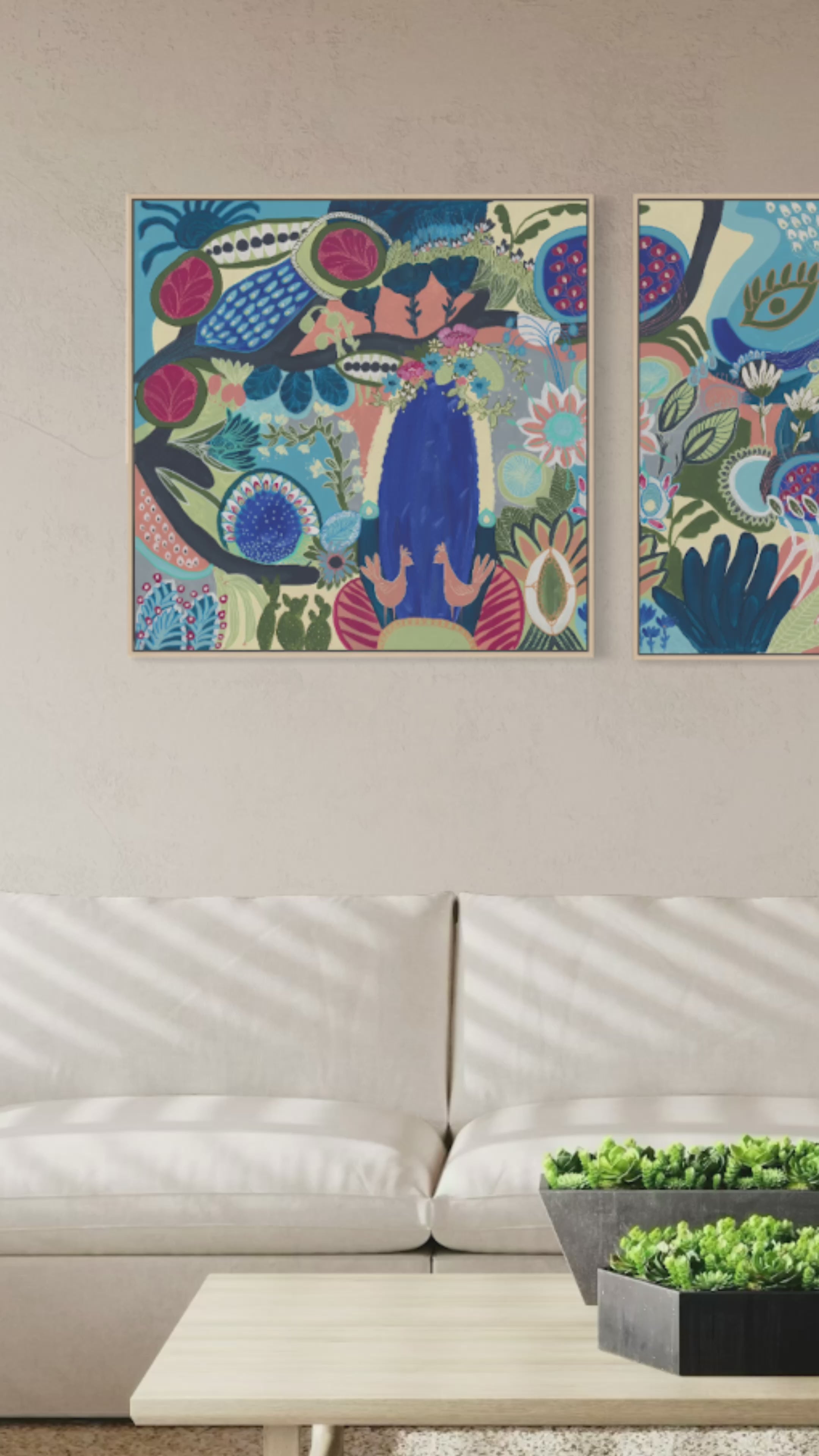 This painting started as two colours. The ultramarine blue colour is called Frida, and the hot fuchsia pink is called Carmen. So, when those two colours collided on the canvas, I created a story in my head about two friends, sisters, or lovers called Frida and Carmen, having a jaunt through the jungle eating A LOT of fruit.