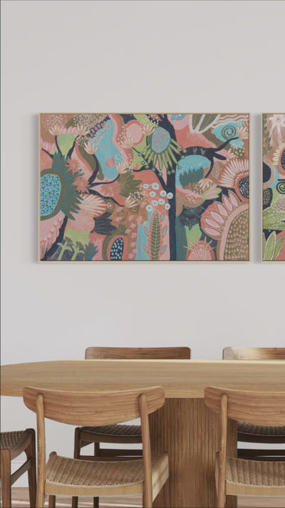 "Mother Nature" is dedicated to my mum, who was a florist, as she has always asked my sister and I to marvel at the miracle of our natural world. She is famous for saying - "Look at the Nature!" It pairs up nicely with "Where the Wild Saskia Grows" as they have the identical colour palette and continues the joyful romp through a botanical wonderland.