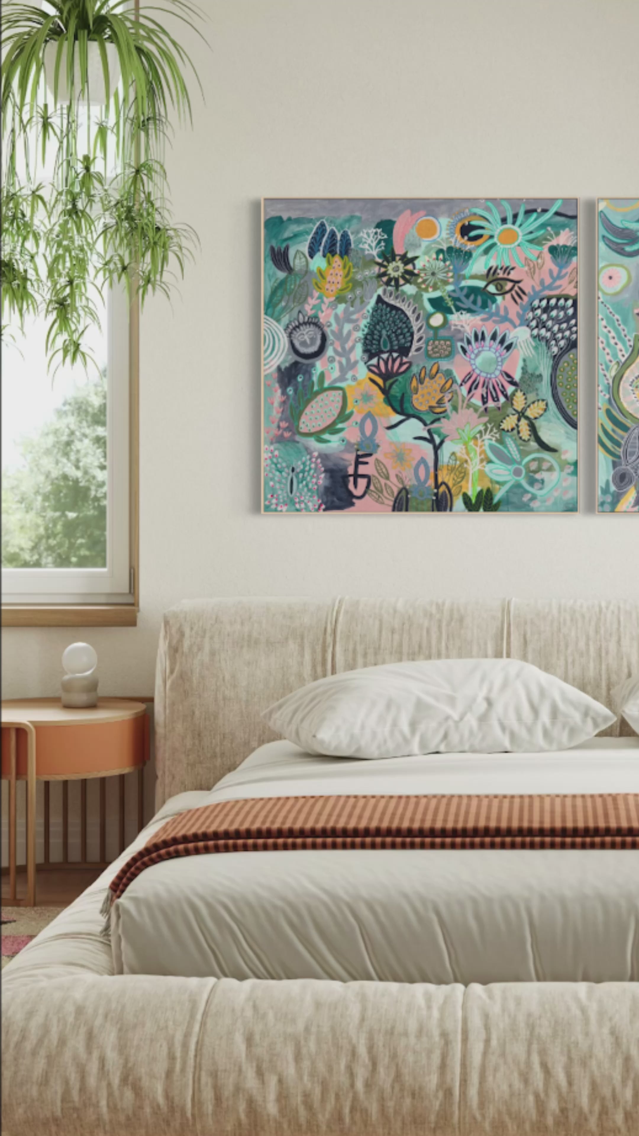 These paintings are a joyful jaunt through an abstracted landscape and filled with all the things I love: flowers, succulents, native seed pods, butterflies, the all-seeing eye, an owl, and even a little blue boat.
