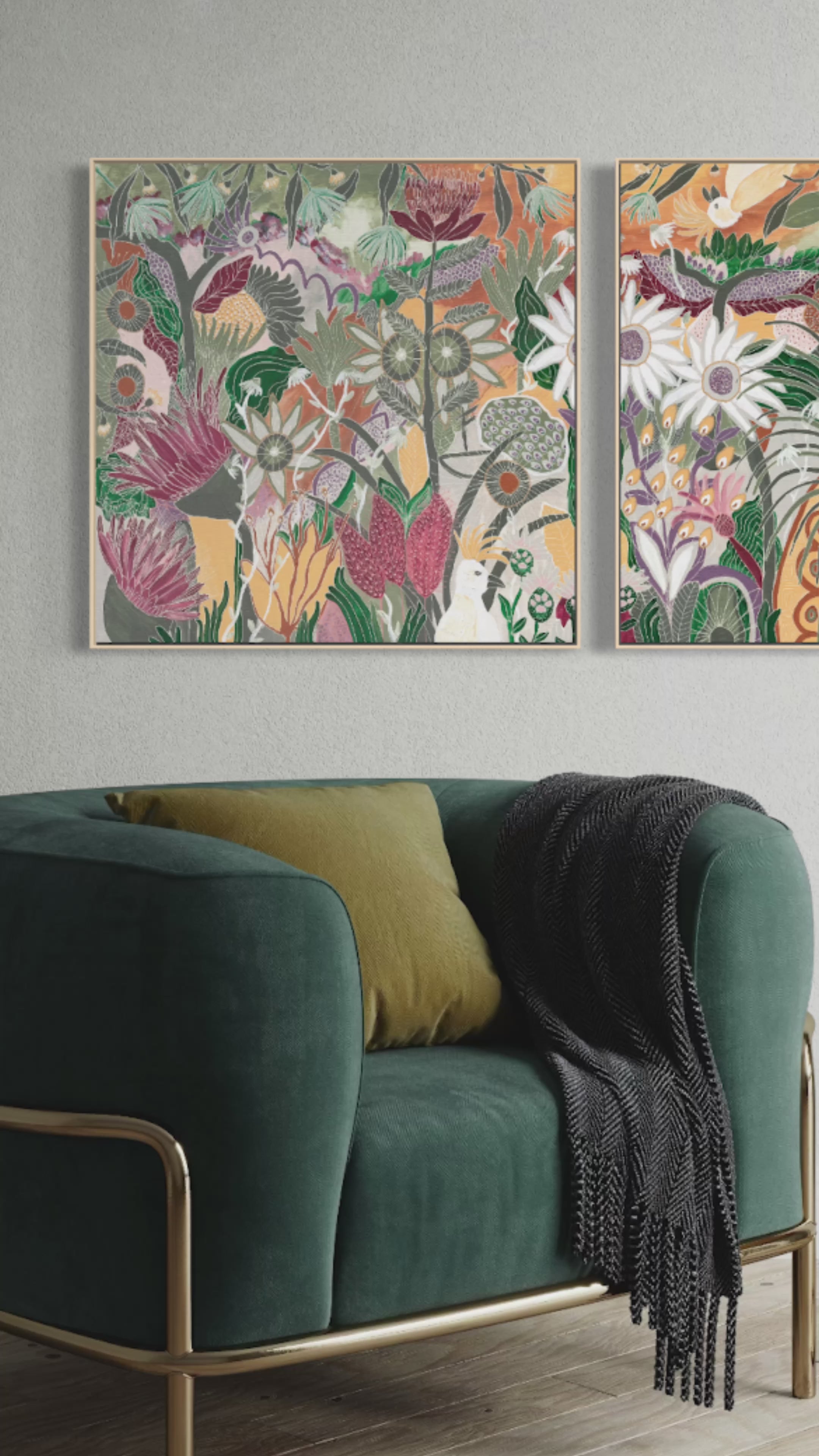 This artwork is called "The Layered Garden" as it is designed in a similar manner that gardens are created with plants and flowers in the foreground, middle and taller layers. Bursting with grass trees, waratah, grevillea, palms and eucalyptus flowers, it is also titled this due to the symbolism layered into the painting to feature two daughters as the large white daisies, footprint flowers to represent the family dog and a new species of "Eduado Avacado" flowers! The portly cockatoos seem pretty happy in the floral chaos.